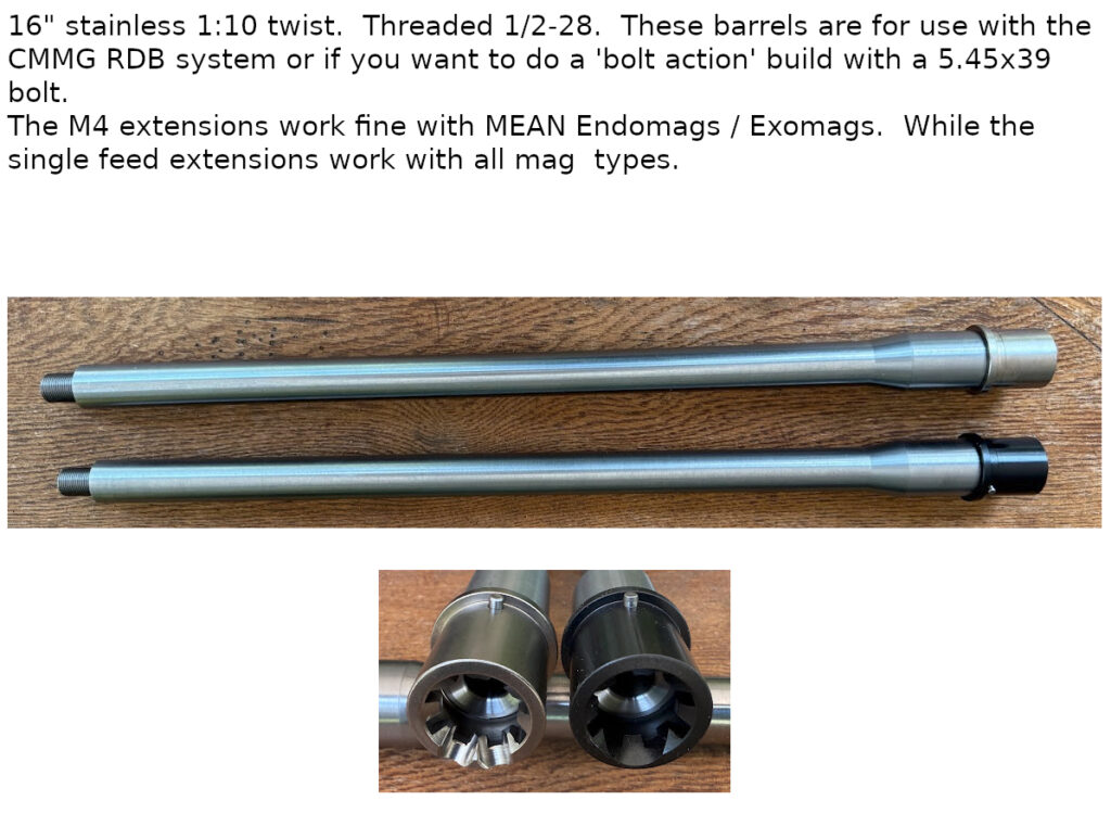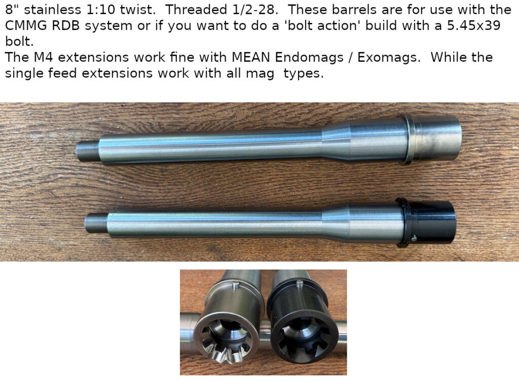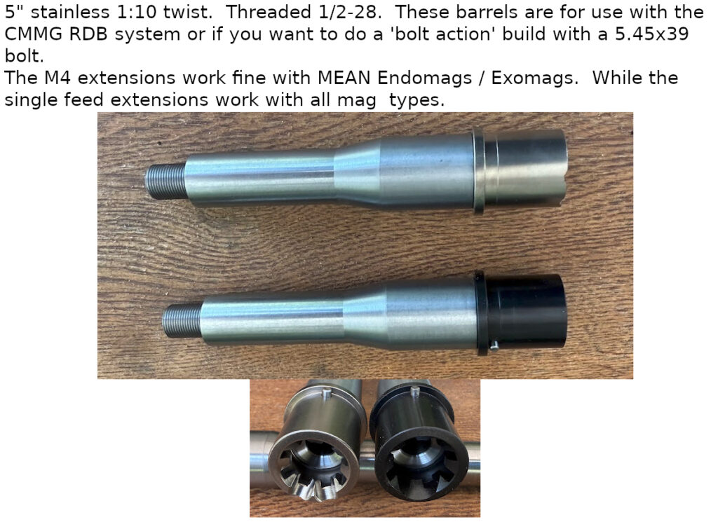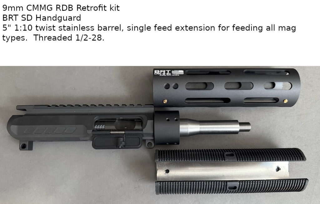 This is a new straight blowback 9mm barrel that has been modified for the CMMG RDB system. Made from a Green Mountain blank. New single feed extension works with all magazine types $230 delivered.