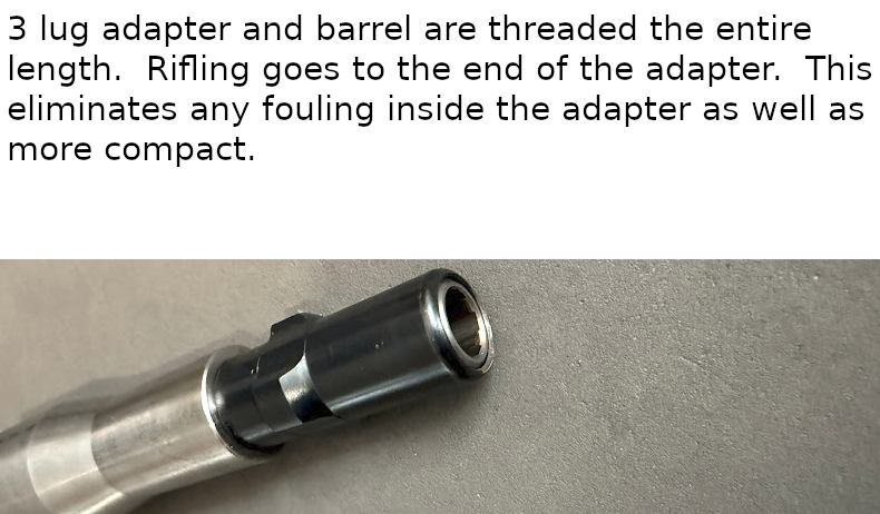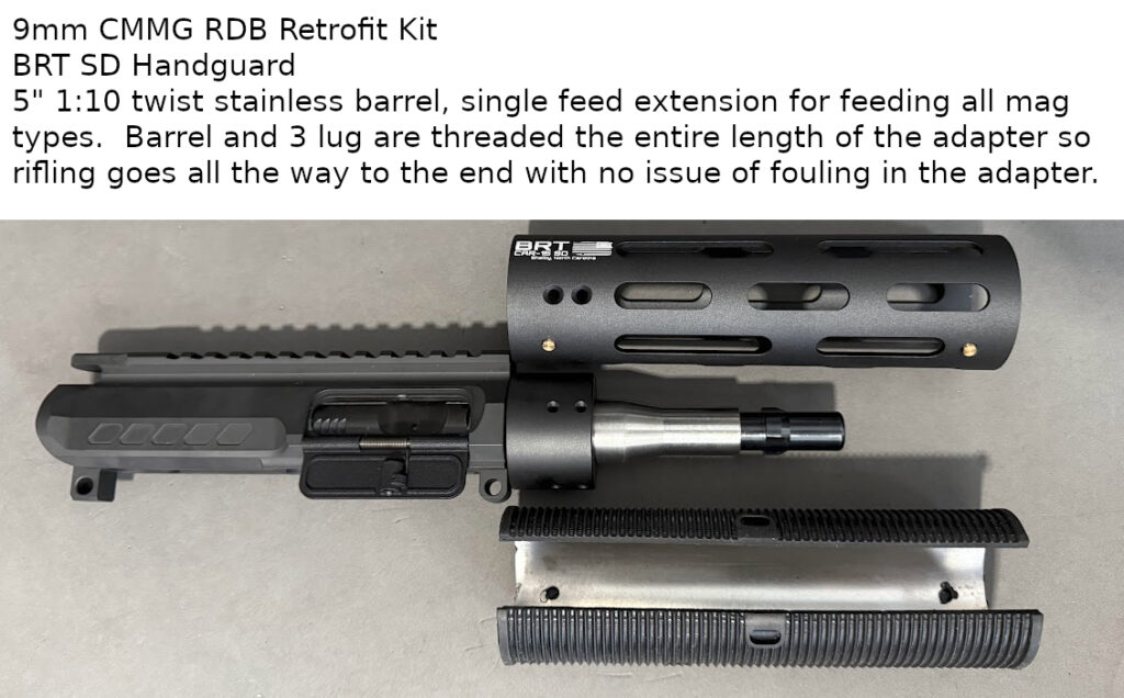 This is a new straight blowback 9mm barrel that has been modified for the CMMG RDB system. Made from a Green Mountain blank. New KVP 3 lug adapter has had the threads extended the entire length and the barrel threaded to match. This eliminates a free bore condition typical with 3 lug adapters. Also reduces the overall length. New single feed extension works with all magazine types. $280 delivered.