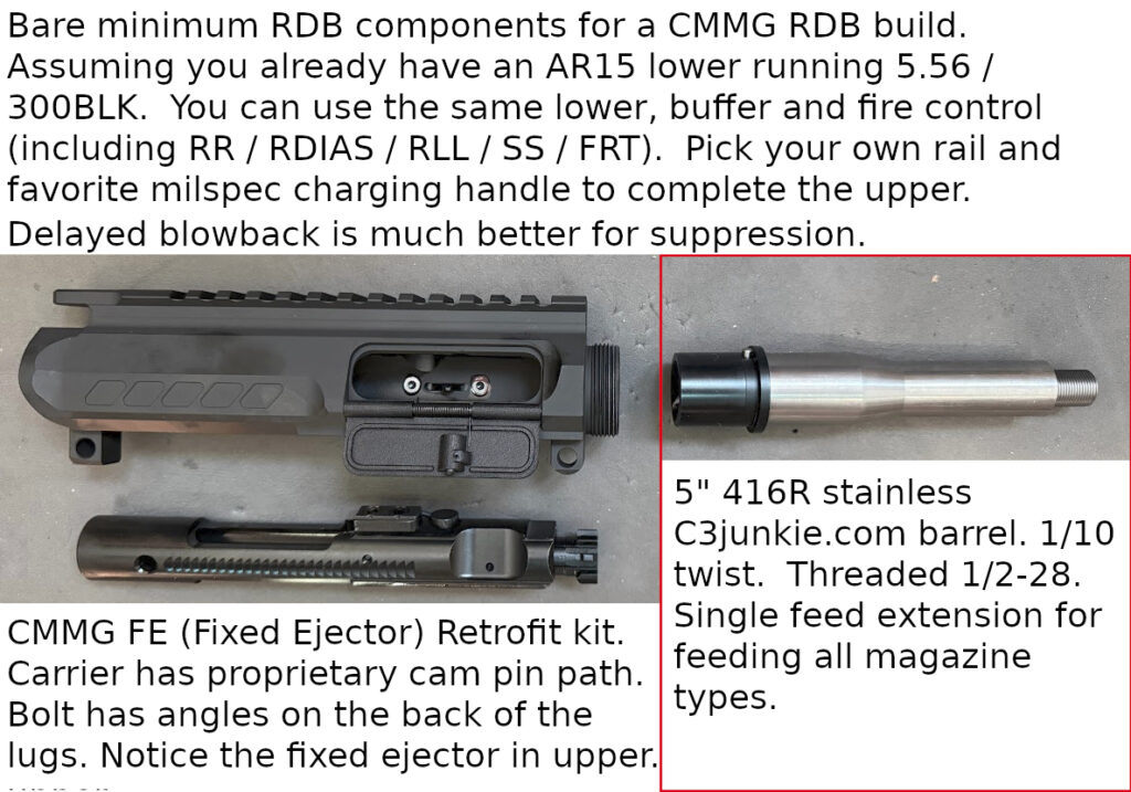 For non-ported barrels you can buy them CMMG as well but be warned that QC has been spotty on them. This is discussed with several threads referenced here: https://c3junkie.com/?page_id=1882. I sell 416R stainless barrels in 5″, 8″, 10.5″ and 16″ threaded 1/2-28″ for less than CMMG. These also have the same single feed extension for feeding all mag types. https://c3junkie.com/?product_cat=cmmg-rdb-compatible-barrels-also-for-bolt-action-builds